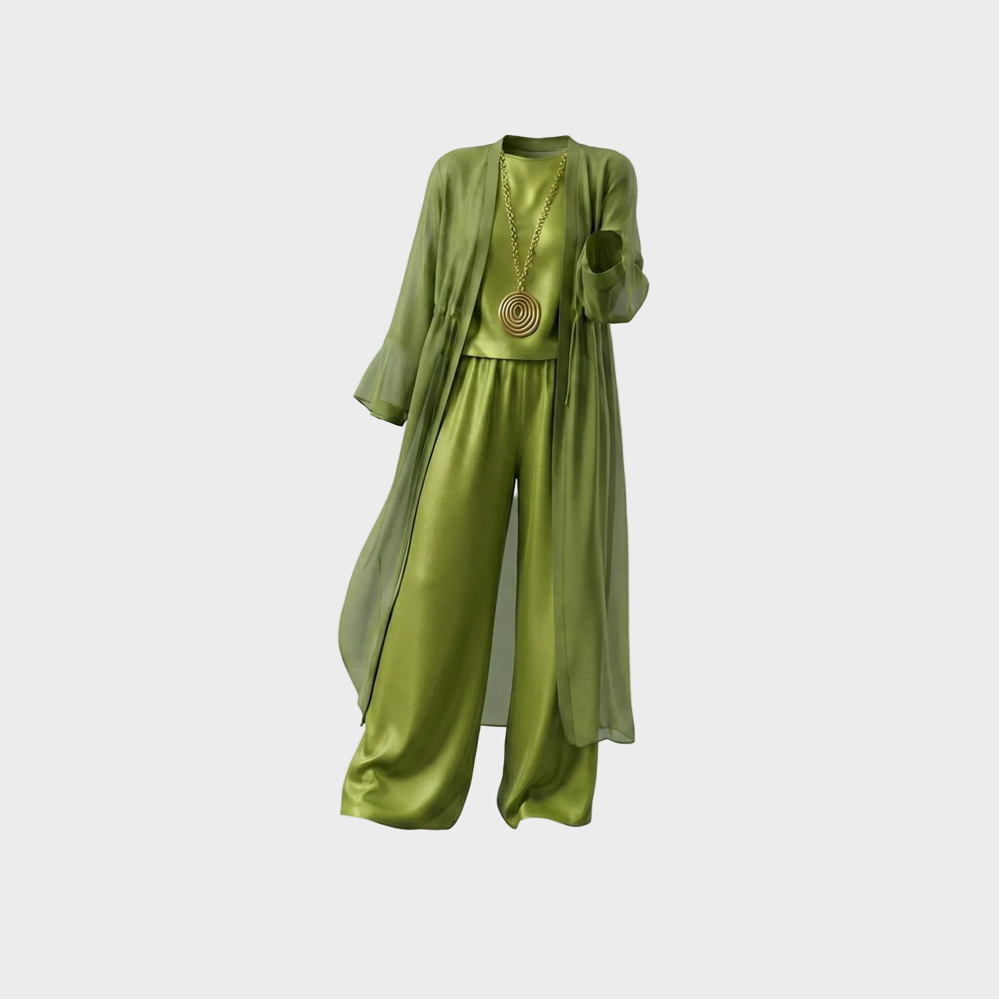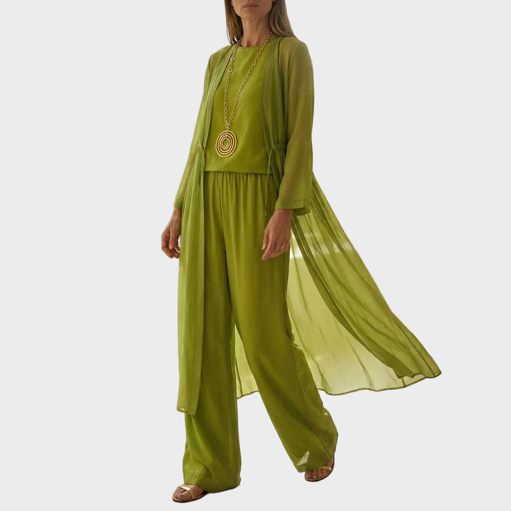 Wszechstronność w trzech częściach: Zawiera top bez rękawów, szerokie spodnie i długi kardigan dla pełnego looku.
