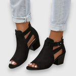 Eleganckie sandały na grubych obcasach, z otwartym noskiem i wyciętym designem. Zamek z tyłu zapewnia bezpieczne dopasowanie i nowoczesny wygląd.