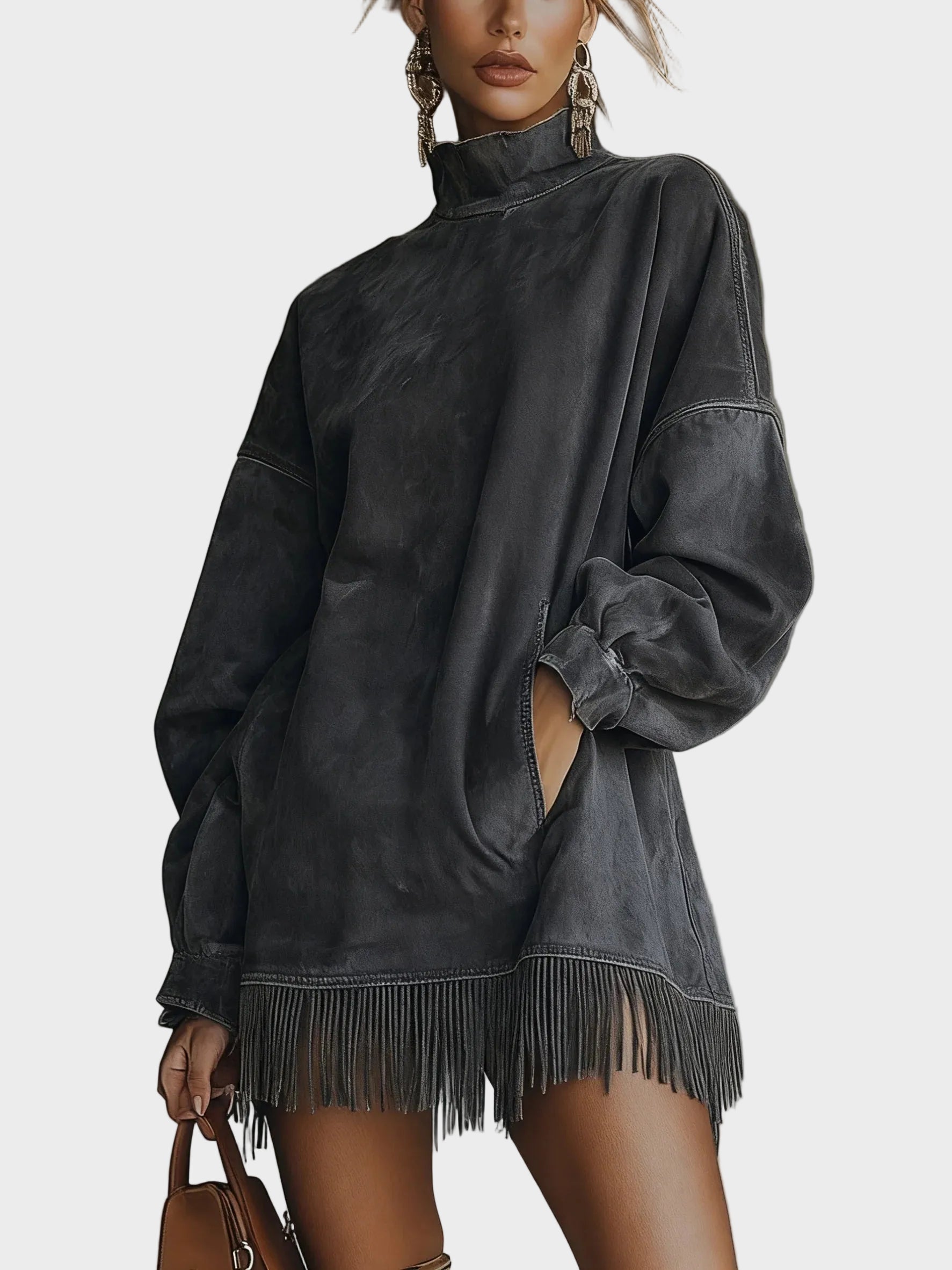 Design: Wysoki dekolt, szerokie rękawy oraz nowoczesna, luźna sylwetka. Zabawne frędzle u dołu dodają odrobinę ruchu i stylowego akcentu.